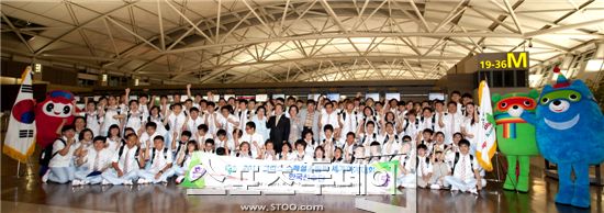 [스포츠투데이 조범자 기자]오는 26일 그리스 아테네에서 개막되는 2011 그리스 스페셜올림픽 세계하계대회에 참가하는 한국선수단이 장도에 올랐다.한국 선수단은 19일 오후 8시 30분 인천국제공항에서 김병덕 한국스페셜올림픽위원회 수석부회장을 비롯한 한국스페셜올림픽위원회 임원진, 선수단 및 가족 등 200여명이 참석한 가운데 출정식을 갖고 20일 오전 0시 50분 카타르항공883편으로 출국, 16일간의 열전에 들어간다. 김병덕 부회장은 이번 대회에 출전하는 선수단에게 성적도 중요하지만 차기대회인 2013 평창동계스페셜올림픽 개최국 선수로서 멋진 경기를 펼쳐 한국을 널리 알려달라고 당부했다. 이날 행사장에는 2013 평창동계스페셜올림픽 조직위원회의 공식 마스코트인 라,인,바우 가 함께해 퍼포먼스를 통한 선수단 응원을 펼쳤다. 2013 평창동계스페셜올림픽 조직위원회에서는 이번 아테네대회 기간 동안 2013 평창대회 홍보관 운영을 비롯, 대회기인수(문화예술공연)행사 등 다양한 대회홍보활동을 전개할 예정이다.오는 25일부터 7월 4일까지 총 10일간 그리스 아테네에서 열리는 이번 대회는 전세계 185개국에서 7500여명의 선수가 참가하는 스페셜올림픽 사상 최대의 국제대회다. 한국스페셜올림픽위원회에서는 육상, 수영, 보체, 농구, 탁구, 배드민턴, 축구, 골프, 배구, 롤러스케이트, 실외수영 등 총 11개 종목에 선수 80명, 코치 20명, 임원 11명을 파견한다.한국 선수단은 7월 7일 오후 4시 45분 카타르항공 882편을 통해 귀국한다.스페셜올림픽은 지적발달장애인들이 스포츠활동을 통하여 잠재능력 계발 및 사회적응력 향상, 그리고 장애인과 비장애인이 함께 더불어 사는 사회를 만들어가기 위해 4년마다 동하계대회가 개최되며, 2013년 1월에는 평창에서 동계스페셜올림픽이 열릴 예정이다.[사진=2013 평창 동계스페셜올림픽 조직위원회]