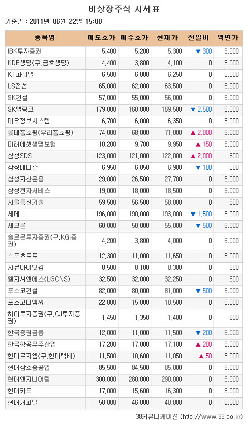 [아시아경제 천우진 기자] 장외주식 시장이 하락 하루 만에 다시 상승했다.기업공개(IPO) 관련주로 오는 24일 코스닥 상장 예정인 자동차 금형 제조업체 탑금속이 8100원(+1.25%)으로 상승했다. 오는 23일 공모 청약 예정인 한국항공우주산업은 1만7100원(+1.18%)으로 4거래일 만에 반등했다. 이달 30일 공모 청약 예정인 의류 판매업체 신세계인터내셔날이 8만1000원(+3.85%)으로 6일 연속 상승하며 최고가 행진을 이어갔다. 다음달 13일 공모 예정인 LCD 부품 제조업체 상아프론테크는 7750원(+5.44%)으로 급등했다. 코스닥 상장 승인기업인 반도체 장비 제조업체 아이씨디도 3만4150원(+3.17%)으로 6일째 최고가 행진을 이어갔다.삼성 관련주로는 반도체 세정장비업체 세메스와 반도체 장비업체 세크론이 각각 19만3000원(-0.77%), 5만5000원(-0.90%)으로 약세를 보였다. 의료장비 업체 삼성메디슨은 6900원(-1.43%)으로 내려 3거래일 동안 약세가 이어졌다. 정보통신기술(ICT) 서비스기업 삼성SDS는 12만2000원(+1.67%)으로 4거래일 동안 상승세가 이어졌다.금융 관련주로 증권담보 대출업체 한국증권금융이 1만1500원(-1.71%)으로 낙폭을 확대하며 52주 최저치를 기록했다. 기업은행 증권자회사 IBK투자증권은 5300원(-5.36%)으로 급락하며 연중 최저가로 밀려났다. 생명보험사 미래에셋생명은 9950원(+1.53%)으로 7일만에 상승 전환했다.그밖에 홈 쇼핑업체 롯데홈쇼핑이 7만1000원(+2.90%)으로 올라 5주 최고가를 경신했다. 합금철 제조업체 동부메탈은 2만2750원(+1.11%)으로 상승했고 현대로지엠과 디비정보통신도 각각 1만1050원(+0.45%), 2500원(+4.17%)으로 오르며 장을 마감했다.자료제공: