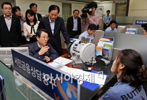 [아시아경제 이재문 기자]취임 후 첫 서민금융지원 현장을 나선 권혁세 금융감독원장이 23일 오후 서울 신한은행 여의도중앙지점에서 서진원 신한은행장과 함께 고객 상담을 하고 있다.이재문 기자 moon@<ⓒ세계를 보는 창 경제를 보는 눈, 아시아경제(www.asiae.co.kr) 무단전재 배포금지>