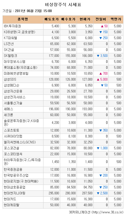 [아시아경제 천우진 기자] 비상장주식 시장이 급등하며 이틀 연속 상승했다.기업공개(IPO) 관련주로 24일 코스닥 상장 예정인 자동차 금형제조업체 탑금속이 8350원(+3.09%)으로 이틀 연속 오르며 장외 거래를 마쳤다. 이날 공모 청약 첫날인 한국항공우주산업은 1만6900원(-1.17%)으로 반등 하루 만에 하락했다.한편 이달 30일 공모 청약 예정인 의류판매업체 신세계인터내셔날은 8만2000원(+1.23%)으로 7일 연속 올라 신고가를 경신했다. 코스닥 상장 승인기업인 디스플레이 장비 제조업체 아이씨디도 3만5150원(+2.93%)으로 13거래일 동안 상승세를 이어가며 최고가를 갈아치웠다.범 현대 계열 관련주로 토목 엔지니어링 서비스업체 현대엔지니어링과 디지털 맵 서비스기업 현대엠엔소프트가 각각 28만7500원(-0.86%), 1만8250원(-0.54%)으로 하락세가 지속됐다. 조선업체 현대삼호중공업도 8만4750원(-0.29%)으로 사흘 동안 약세를 이어갔다.삼성 관련주로 초음파 진단기 전문기업 삼성메디슨은 6850원(-0.72%)으로 내려 4거래일 동안 약세를 나타냈다. 정보통신기술(ICT) 서비스기업 삼성SDS는 12만7000원(+4.10%)으로 이틀 연속 오르며 5거래일 동안 상승세를 이어갔다.금융 관련주로는 생명보험사 KDB생명이 3950원(-3.66%)으로 내렸다. 미래에셋생명은 1만650원(+7.04%)으로 급등했고 IBK투자증권은 5350원(+0.94%)으로 이틀 만에 반등했다.그밖에 SK텔레콤 통신서비스 자회사 SK텔링크는 16만6000원(-2.06%)으로 4거래일 연속 내려 52주 최저가로 밀려났다. 복권시스템 사업자 코리아로터리서비스와 체육복표 발행 사업자 스포츠토토는 각각 2만3700원(-4.24%), 1만1300원(-3.00%)으로 하락하며 장을 마감했다.자료제공: