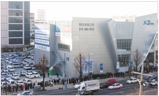 GS건설이 광주 ‘첨단자이2차’ 분양 신청을 접수한 날 견본주택에 수많은 고객이 몰려 북새통을 이뤘다.
