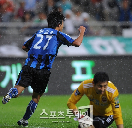 [상암=스포츠투데이 정재훈 기자] 25일 오후 서울월드컵경기장에서 열린 '현대 오일뱅크 K리그 2011' FC서울과 인천 유나이티드의 경기에서 선제골을 터뜨린 한교원(왼쪽, 인천)이 주먹을 쥐고 있다.스포츠투데이 정재훈 사진기자 roze@<ⓒ아시아경제 & 재밌는 뉴스, 즐거운 하루 "스포츠투데이(stoo.com)">