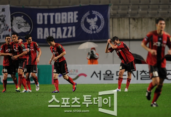 [상암=스포츠투데이 정재훈 기자] 25일 오후 서울월드컵경기장에서 열린 '현대 오일뱅크 K리그 2011' FC서울과 인천 유나이티드의 경기에서 데얀(오른쪽, 서울)이 동점골을 터뜨린 후 깜찍한 댄스를 선보이고 있다.스포츠투데이 정재훈 사진기자 roze@<ⓒ아시아경제 & 재밌는 뉴스, 즐거운 하루 "스포츠투데이(stoo.com)">