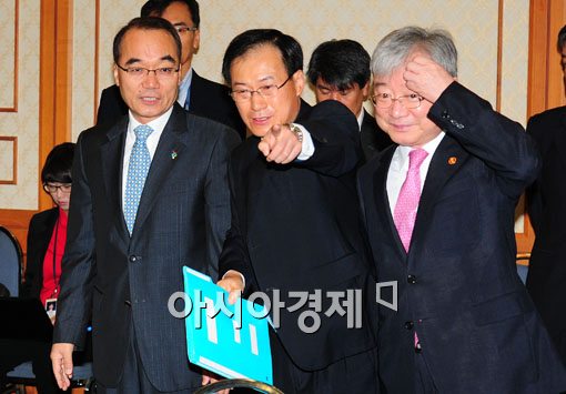 [아시아경제 윤동주 기자] 27일 오전 서울 여의도 국회에서 열린 하반기 경제정책 방향 당정협의회에 박재완 기획재정부 장관(왼쪽)이 김석동 금융위원장(오른쪽)등 참석자들과 이야기를 나누고 있다.윤동주 기자 doso7@<ⓒ세계를 보는 창 경제를 보는 눈, 아시아경제(www.asiae.co.kr) 무단전재 배포금지>