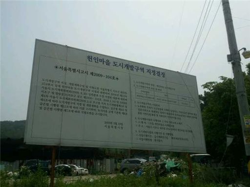 삼부토건과 동양건설산업이 추진하다가 프로젝트파이낸싱(PF) 대출금을 못 갚고 법정관리에 이르게 되면서 주목받게 된 헌인마을 입구. 과거 나환자촌, 영세가구단지 무허가판자촌에서 고급주거단지로 추진되고 있었다.