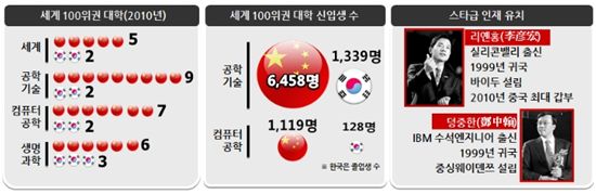 류 연구전문위원은 “중국은 세계 100위권 대학 및 대학생 수가 한국보다 많아 잠재적인 인재경쟁력이 높다”며 “대학의 글로벌 연구역량을 나타내는 기초과학순위평가에서 베이징대, 칭화대, 푸단대 등 7개 대학의 상위 1% 수준 학과는 2001년 24개에서 2010년 74개 학과로 증가했다”고 언급했다.그는 “핵심 인재를 적시에 공급하기 위해서는 경쟁력을 확보해야 하는 분야를 선정해 우수대학에 ‘선택과 집중’의 과감한 투자를 시행할 필요가 있다”고 강조했다. 각 대학이 미래산업의 인재경쟁력 강화 차원에서 '소수정예 연구중심대학', '교육중심대학', '직업교육대학', '지역산업 특화대학' 등으로 재편하는 방안을 고민해야한다는 설명이다.또한 “기업이 필요로 하는 인재 수요를 정부와 대학이 선제적으로 파악해 인재를 공급하는 '수요자 중심의 인재정책'을 실시해야 한다”며 “이를 위해 정부와 대학에 각각 '산학인재위원회'를 설치해 산업의 인재 수요 및 정책 요구사항을 상시 반영할 것”을 제안했다.이밖에 그는 “산업의 기술 수준별 인재 육성·확보 포트폴리오 정책을 마련하고 운영해야 한다”며 “원천기술과 관련된 고급두뇌는 국내에서 양성하되 시급한 실용 및 응용 기술은 해외 우수인재를 적극 활용하고, 과학기술 인력이 풍부한 인도, 중국 등의 인재 육성 프로그램에 한국기업이 직접 투자해 인재를 선점할 것”을 당부했다.조슬기나 기자 seul@<ⓒ세계를 보는 창 경제를 보는 눈, 아시아경제(www.asiae.co.kr) 무단전재 배포금지>