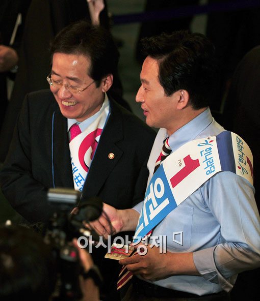 [아시아경제 윤동주 기자] 한나라당의 새 지도부를 선출하기 위한 전당대회가 열리는 4일 서울 송파구 방이동 올림픽공원 체조경기장에서 원희룡 후보(오른쪽)와 홍준표 후보가 투표하기에 앞서 악수를 하고 있다.윤동주 기자 doso7@<ⓒ세계를 보는 창 경제를 보는 눈, 아시아경제(www.asiae.co.kr) 무단전재 배포금지>