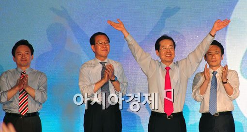 [아시아경제 윤동주 기자] 4일 서울 송파구 잠실 올림픽체조경기장에서 열린 12차 한나라당 전당대회에서 신임 대표로 선출된 홍준표 당선자가 당원들에게 손을 흔들고 있다.윤동주 기자 doso7@<ⓒ세계를 보는 창 경제를 보는 눈, 아시아경제(www.asiae.co.kr) 무단전재 배포금지>
