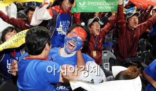 [아시아경제 이재문 기자]2018 동계올림픽 개최지가 평창으로 확정된 가운데 7일 강원 평창군 알펜시아리조트 스키점프대 앞에서 학생들이 환호하고 있다.이재문 기자 moon@<ⓒ세계를 보는 창 경제를 보는 눈, 아시아경제(www.asiae.co.kr) 무단전재 배포금지>