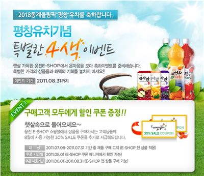 [아시아경제 조해수 기자] 웅진식품이 2018년 평창 동계올림픽 유치를 기념해 이달 말까지 ‘평창 유치기념, 특별한 4색 이벤트’를 실시한다고 8일 밝혔다. 이번 이벤트는 웅진식품의 온라인 쇼핑몰 ‘햇살이샵(//eshop.wjfood.co.kr)’에서 상품을 구매하신 고객 전원에게 30% 할인 쿠폰을 지급하는 이벤트로, 8일부터 오는 31일까지 진행된다. 해당 기간 동안 제품을 구매하신 고객은 누구나 30% 할인 쿠폰을 지급받을 수 있다. 할인쿠폰은 다음달 1일부터 사용할 수 있다. 이 외에도 ‘햇살이샵’에서는 ‘자연은 내사랑 드링크팩’, ‘자연은 알로에, 토마토, 감귤 선물세트’ 등 다양한 할인 상품을 선보이고 있다. 이연승 웅진식품 햇살이샵 담당 과장은 “동계올림픽 유치라는 국가적 기쁨을 국민과 함께 나누고자 이번 행사를 준비하게 됐다”며 “앞으로도 햇살이샵은 다양한 이벤트를 준비해 항상 고객과 함께 하겠다”고 말했다.조해수 기자 chs900@<ⓒ세계를 보는 창 경제를 보는 눈, 아시아경제(www.asiae.co.kr) 무단전재 배포금지>