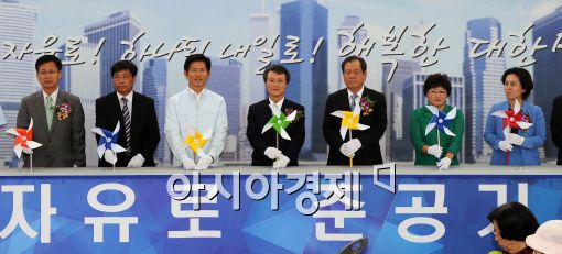 [아시아경제 이재문 기자]13일 오후 경기도 고양시 법곳IC에서 열린 제2자유로 준공기념식에서 김문수(왼쪽 세번째부터) 경기지사, 권도엽 국토해양부 장관, 이지송 한국토지주택공사(LH) 사장을 비롯한 주요 참석자들이 준공 세리머니를 하고 있다. 이재문 기자 moon@<ⓒ세계를 보는 창 경제를 보는 눈, 아시아경제(www.asiae.co.kr) 무단전재 배포금지>