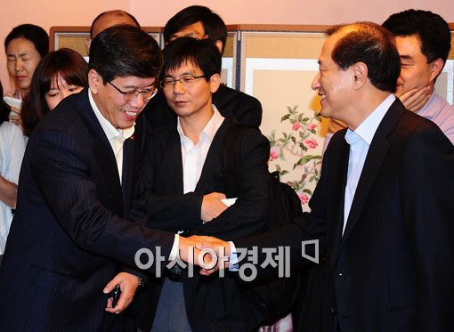 [아시아경제 윤동주 기자] 14일 오후 서울 종로구의 한 음식점에서 열린 방통위-이통사 CEO 간담회가 열렸다. 간담회에 참석한 이상철 LG유플러스 부회장이 하성민 SK텔레콤 사장과 악수를 나누고 있다.윤동주 기자 doso7@<ⓒ세계를 보는 창 경제를 보는 눈, 아시아경제(www.asiae.co.kr) 무단전재 배포금지>