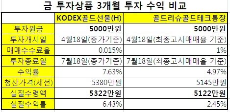 ◆수수료와 거래규모도 변수= 수수료 차이도 작지 않아 실질 수익에 큰 영향을 미치는 것으로 나타났다. 3개월간 5000만원을 금ETF에 투자한 경우 실제로 손에 쥔 수익은 380만원이 넘는다. 석달동안의 실질 수익률이 6.43%에 달한 것. 반면 같은기간(최종고시 매매기준율 기준) 금통장은 금ETF의 절반에 못 미치는 144만원 가량의 수익을 남겼다. 실질수익률은 2.44%로 금ETF와의 수익률 격차가 3.99%포인트로 벌어지는 셈.증권사별로 차이가 있기는 하지만 금ETF를 홈트레이딩시스템(HTS)으로 사고팔때 수수료는 대개 0.030%가 들어간다. 반면 금통장은 외화를 샀다가 되파는 것과 마찬가지여서 환전 수수료와 유사하게 2%를 은행에 내야 한다. 다만 금통장의 경우 인터넷뱅킹과 계좌이체 등을 이용하면 수수료는 1.2%까지 낮아질 수 있다.하지만 거래규모에 따라서는 선택에 제한이 생긴다. 금통장의 경우 동일한 가격으로 5000만원이든 1억원이든 자유롭게 매입할 수 있다. 반면, 금ETF의 경우 주식과 마찬가지로 팔겠다는 상대방이 있어야 하는데, 거래량이 하루평균 3억원 수준에 불과하다. 한꺼번에 대량을 사려들면 아주 비싼 값을 치러야 한다는 의미다.정재우 기자 jjw@<ⓒ세계를 보는 창 경제를 보는 눈, 아시아경제(www.asiae.co.kr) 무단전재 배포금지>