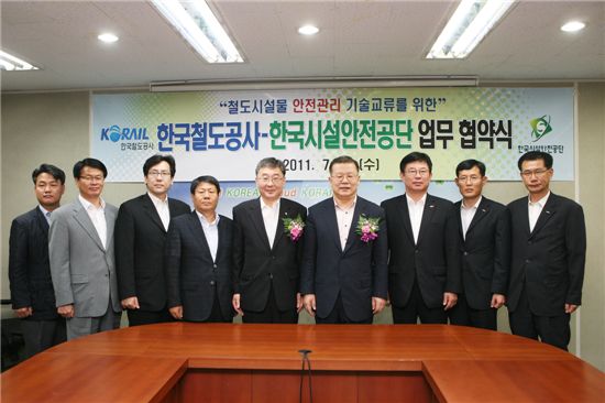 코레일과 한국시설안전공단 관계자들이 ‘철도시설물 안전관리기술교류를 위한 업무협약’을 맺고 기념사진을 찍고 있다.