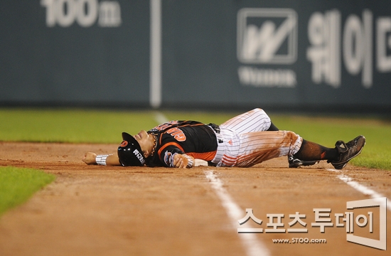 [잠실=스포츠투데이 정재훈 기자] 20일 오후 잠실 야구장에서 열린 '2011 롯데카드 프로야구' 두산 베어스와 롯데 자이언츠의 경기 6회초 롯데 1루주자 홍성흔이 귀루하다 아웃당하자 1루 베이스에 누워 웃고있다. 스포츠투데이 정재훈 사진기자 roze@<ⓒ아시아경제 & 재밌는 뉴스, 즐거운 하루 "스포츠투데이(stoo.com)">