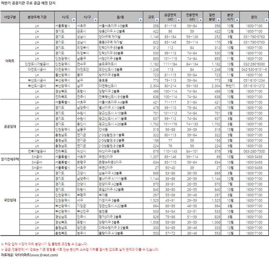 [아시아경제 조민서 기자]올 하반기(7~12월) 한국토지주택공사(LH), SH공사 등에서 공급을 예정하고 있는 물량은 얼마나 될까? 부동산정보업체 닥터아파트에 따르면 하반기 공공에서 총 60곳 3만6563가구가 공급 예정이다. 사업별로는 ▲분양아파트 25곳 1만4817가구 ▲공공임대 13곳 6573가구 ▲장기전세주택 2곳 703가구 ▲국민임대 20곳 1만4470가구가 계획돼 있다. 물량 확정이 안 된 보금자리주택지구 본청약은 제외했다.특히 수도권은 서울서초지구와 광교신도시에서 분양은 물론 공공임대 물량이 대거 쏟아질 예정이다. 지방에서는 부산, 전북혁신도시 첫 분양과 세종시 공공임대 공급이 예정돼 있다. ◆ 분양 - 첫 분양 나서는 지역 눈여겨 볼 만LH는 보금자리주택지구 서울서초지구 A5블록에 81~116㎡ 358가구를 분양한다. 분양시기는 10월 예정이다. A5블록은 양재대로를 사이에 두고 우면2지구와 마주 보고 있다. 양재천 조망이 가능하고 이마트(양재점), 코스트코(양재점) 등의 대형 편의시설을 차량으로 5~10분정도면 이용할 수 있다.LH공사의 의정부 민락2지구 첫 분양을 9월경 시작한다. 지난 20일 국민임대 2곳을 공급한데 이어 분양에서는 첫 물량으로 의정부 거주자들의 관심이 높다. 이 때 분양 예정인 블록은 B5, B6블록으로 각각 312가구(112㎡), 530가구(99, 113㎡) 규모다. 두 블록 모두 전용 85㎡이하 중소형아파트로만 이뤄져 주택청약종합저축 또는 청약저축 가입자만이 청약할 수 있다. 단지 위치는 지구 내에서도 북동쪽이며 현재 송양초등 동쪽이다. 성남시 단대구역과 중동3구역 분양에도 LH공사가 나선다. 단대구역은 1140가구 중 85~164㎡ 252가구가 일반분양분으로 대우건설이 시공을 맡는다. 중동3구역은 롯데건설이 시공하고 규모는 622가구 중 85~146㎡ 170가구가 일반분양 물량이다. 분양시기는 두 곳 모두 9월 예정이다. 걸어서 2~3분이면 서울지하철 8호선 남한산성입구역과 단대오거리역을 각각 이용할 수 있는 역세권 단지다.인천도시개발공사는 인천 연수구 송도국제도시에 111~184㎡ 1182가구를 10월 분양한다. 중소형아파트 대형아파트가 섞여 있기 때문에 면적에 따라 청약저축, 예금 통장을 사용할 수 있다. 시공사는 포스코건설이다. 인천지하철 1호선 테크노파크역과 지식정보단지역 중간 지점이고 포스코글로벌 R&D센터, 연세대 국제캠퍼스 남서쪽에 접해 있다. 지방에서는 LH뿐만 아니라 지방 공사 분양이 대기 중이다. 대전 도안신도시 5블록에는 대전도시공사가 113㎡ 1248가구를 분양한다. 시기는 10월 예정이다. 전용 85㎡이하이기 때문에 주택청약종합저축 혹은 청약저축 통장을 사용해야 한다. 주변 한라비발디, 트리풀시티 등이 올해부터 입주를 시작하기 때문에 트리풀시티2차 입주 시에는 편의시설, 학군 이용이 편리할 것으로 예상된다. LH공사는 울산 동구 방어지구 B블록 분양을 11월경 시작할 예정이다. 분양 가구수는 81~115㎡ 7백23가구. 대왕암공원, 방어진항, 일산해수역장 등 주변 자연환경이 수려한데다 방어진시외버스터미널이 걸어서 5분 거리고 방어진초등, 화진초등도 도보 통학권에 속한다.하반기에는 혁신도시 내 첫 분양도 계획돼 있다.우선 부산도시공사는 부산 대연혁신도시에서 2304가구(80~214㎡) 규모의 대단지 분양을 하반기 중 진행할 예정이다. 시공은 1공구를 현대건설, 2공구를 대우건설이 맡았다. 대연혁신도시는 부산지하철 2호선 경성대·부경대역 북동쪽에 조성되는 혁신도시다. 15만6000㎡ 면적에 2500가구가 계획돼 있다. 혁신도시 내에 학교, 공원도 조성될 예정이다. 전북 전주시 중동 일대에 조성되는 전북혁신도시 첫 분양은 LH가 준비하고 있다. 10월경 B-8블록에 110~114㎡ 638가구를 분양 예정이다. 전북혁신도시는 전주시 도심에서 서쪽 외곽지역에 조성된다. 혁신도시 내에 농촌진흥청 등의 기관이 이전하며 기존 전라북도청, 전주시청, 완주군청 등 공공기관도 인접해 있다. B-8블록은 중심상업지구와 가깝다는 게 장점이다. ◆공공임대 - 인기 높은 서울서초지구, 광교신도시 눈길하반기 공공임대 공급 물량 중 알짜 단지가 많다. 특히 수도권 청약자들에게 인기가 높은 보금자리주택지구와 광교신도시 물량이 대거 예정된 상태다.LH는 서울서초지구 A4블록에 71~117㎡ 421가구를 10월경 공급할 계획이다. 서울서초지구는 보금자리주택지구이며 A4블록은 지구 동쪽에 위치하고 남쪽으로 양재천이 흐르고 있어 산책, 운동 등을 할 수 있다. 과천~의왕간 고속도로와 양재대로가 교차하는 선암인터체인지가 인접해 자가용 이용도 편리하다.광교신도시에서는 3개 블록에서 총 3040가구의 공공임대 물량이 쏟아질 예정이다. 모두 LH가 공급하며 A10, 11블록은 중소형아파트로만 구성돼있고 A26블록은 중소형, 대형아파트가 골고루 이뤄져 있다. 블록별 가구수는 ▲A10블록 101~112㎡ 701가구 ▲A11블록 99~112㎡ 637가구 ▲A26블록 101~178㎡ 1702가구다. 입지를 살펴보면 A10, 11블록은 신도시 중심부에 위치하고 경기도 신청사가 들어설 부지와 신분당선 연장구간 역(2016년 2월 개통 예정)이 인접해 있다. 또 중심상업시설과 호수공원으로 조성될 원천저수지 이용도 편리하다. 광교신도시의 가장 동쪽에 위치한 A26블