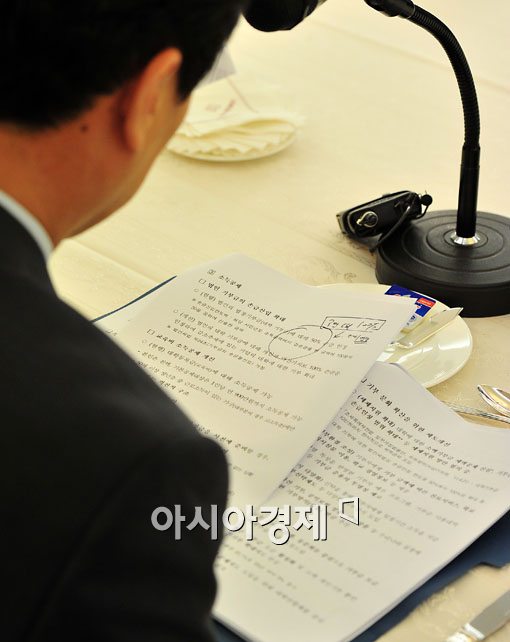 [아시아경제 윤동주 기자] 이주호 교육과학기술부 장관이 21일 서울 중구 프레지전트호텔에서 대학 총동창(동문)회장들과 간담회에서 미리 준비해온 모두 발언 내용을 보고 있다.윤동주 기자 doso7@<ⓒ세계를 보는 창 경제를 보는 눈, 아시아경제(www.asiae.co.kr) 무단전재 배포금지>