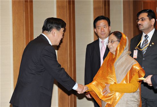 [아시아경제 이창환 기자] 한국무역협회는 26일 프라티바 파틸(Pratibha D. Patil) 인도 대통령 초청 경제단체 환영오찬을 신라호텔 다이너스티홀에서 개최했다. 파틸 대통령은 인도 최초의 여성 대통령으로 지난해 1월 이명박 대통령의 인도 방문에 대한 답방으로 방한했다. 이창환 기자 goldfish@<ⓒ세계를 보는 창 경제를 보는 눈, 아시아경제(www.asiae.co.kr) 무단전재 배포금지>