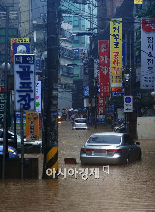 [아시아경제 윤동주 기자] 27일 서울을 비롯한 중부 지방에 내린 폭우로 서울 강남역 인근 도로에 차량들이 불어난 물을 미쳐 피하지 못해 물에 잠겨 고장난채 방치되고 있다.윤동주 기자 doso7@<ⓒ세계를 보는 창 경제를 보는 눈, 아시아경제(www.asiae.co.kr) 무단전재 배포금지>
