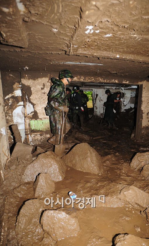 [아시아경제 윤동주 기자] 28일 오전 대규모 산사태가 난 서울 우면산 인근 아파트 현장에서 군장병들이 아파트 가정집으로 밀려들어온 토사와 돌덩이를 치우고 있다.윤동주 기자 doso7@<ⓒ세계를 보는 창 경제를 보는 눈, 아시아경제(www.asiae.co.kr) 무단전재 배포금지>