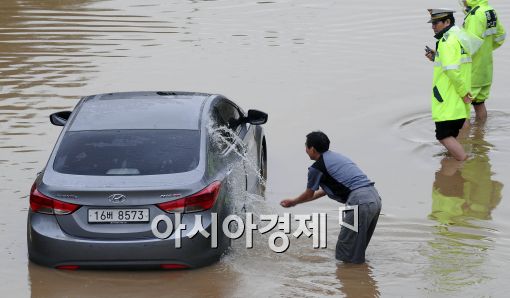 [아시아경제 이재문 기자]한강의 수위가 차츰 내려가고 있는 28일 오후 서울 여의도부근 올림픽대로에 침수되었던 차량 주인이 견인 전 세차를 하고 있다. 이재문 기자 moon@<ⓒ세계를 보는 창 경제를 보는 눈, 아시아경제(www.asiae.co.kr) 무단전재 배포금지>