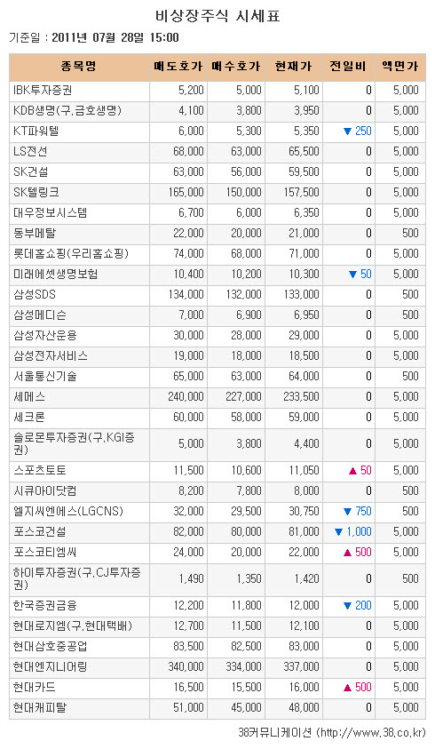 [아시아경제 천우진 기자] 기업공개(IPO) 관련주로 다음달 5일 코스닥 상장 예정인 반도체 및 평판 디스플레이 장비제조업체 아이씨디가 5만4000원(+1.89%)으로 올랐다. 29일 상장을 앞둔 지능형 교통 시스템(ITS) 구축업체 경봉도 9350원(+2.19%)으로 상승했다. 다음달 8일 공모 예정인 바이오디젤 생산업체 제이씨케미칼은 1만1500원(-2.13%)으로 밀려났다.코스닥 상장 승인 기업인 메모리 테스트 핸들러 제조업체 테크윙은 1만7850원(+2.00%)으로 6일 거래일 동안 상승세가 이어졌다. 상장예심 청구 기업으로 환경 친화성 원료 및 코팅제품 제조업체 나노는 9000원(-9.09%)으로 하락세를 면치 못했다.사파이어 단결정 제품생산 및 판매업체 사파이어테크놀로지도 8만4500원(+2.42%)으로 올랐으며 반도체 테스트 업체 아이테스트와 터보기계 및 터보엔진 제품 개발업체 뉴로스는 각각 2770원(+0.73%), 9550원(+0.53%)으로 소폭 오름세를 보였다.금융 관련주로 생명보험사 미래에셋생명이 1만300원(-0.48%)으로 밀려났다. 증권 담보대출 및 증권관련 예금수탁 등 서비스업체 한국증권금융도 1만2000원(-1.64%)으로 하락했다.전업카드사 현대카드는 1만6000원(+3.23%)으로 상승했다. 금형 등 생산 공급업체 포스코티엠씨와 차량부품 제조업체 서진캠도 각각 2만2000원(+2.33%), 3000원(+9.09%)으로 올랐다.종합건설사 포스코건설은 8만1000원(-1.22%)으로 내렸으며 시스템통합(SI) 업체 엘지씨엔에스도 3만750원(-2.38%)으로 하락했다. 주파수 공용 통신(TRS) 사업자 KT파워텔은 5350원(-4.46%)으로 하락하며 장을 마감했다.자료제공: