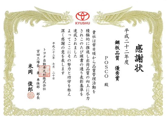 포스코가 일본 도요타 규슈 공장으로부터 수상한 '품질 우수상'