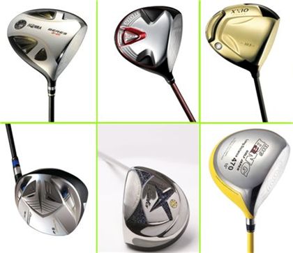 비거리에 초점을 맞춘 시니어골프채. 샤프트는 부드럽지만 길이가 다소 길어지고, 전체 무게는 반면 가볍게 설계됐다. 왼쪽부터 혼마 베레스S-01, PRGR 레드505, 던롭 뉴젝시오프라임, 뱅 롱디스턴스470, 슈리켄 레드시리즈 블루, 웍스 얼티마이저 V4(시계방향으로).