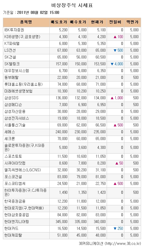 [아시아경제 천우진 기자] 비상장주식 시장이 이틀 연속 올랐다.기업공개(IPO) 관련주로 3일 코스닥 상장 예정인 화장품 제조업체 제닉이 3만3500원(+3.08%)으로 신고가를 기록하며 장외마감했다. 오는 5일 코스닥 상장 예정인 평판 디스플레이 장비 제조업체 아이씨디는 5만8200원(-0.51%)으로 나흘 만에 소폭 조정을 받았다.상장 승인 기업으로 반도체 메모리 테스트 핸들러 제조업체 테크윙이 1만7750원(-0.84%)으로 이틀 연속 하락했다. 심사 청구기업인 터보엔진 기계 제조업체 뉴로스가 9500원(-0.52%)으로 약세로 돌아섰으나, 반도체 업체 테라세미콘과 케이맥은 각각 1만7400원(+4.19%), 1만6500원(+2.48%)으로 상승하며 희비가 엇갈렸다.삼성 관련주로 정보통신기술(ICT) 서비스기업 삼성SDS가 13만4000원(+0.75%)으로 8거래일 만에 반등했다. 홈 네트워크 전문기업 서울통신기술은 6만6500원(+0.76%)으로 이틀 연속 올랐다. 정보보안 솔루션업체 시큐아이닷컴은 8200원(+0.61%)으로 올라 엿새 동안 상승세를 이어갔다.SK관련주로 SK텔레콤의 통신서비스 자회사 SK텔링크가 15만3500원(-2.54%)으로 내려 52주 최저가로 밀려났다. 방송 및 무선통신기기 제조업체 SK텔레시스는 3850원(-9.41%)으로 급락하며 약세로 돌아섰다.제조업 관련주로 절연선 및 케이블 제조업체 LS전선이 6만5000원(-0.76%)으로 하락했다. 코아 및 금형 생산업체 포스코티엠씨와 커피 전문업체 카페베네는 각각 2만2750원(+2.25%), 1만8500원(+12.12%)으로 둘다 강세를 이어가며 신고가를 경신했다.그밖에 복권시스템 사업자 코리아로터리서비스와 전업카드사 현대카드가 각각 1만5000원(-1.64%), 1만5500원(-1.59%)으로 하락했다. 생명보험사 KDB생명은 4200원(+2.44%)으로 이틀 연속 상승하며 장을 마감했다.자료제공: