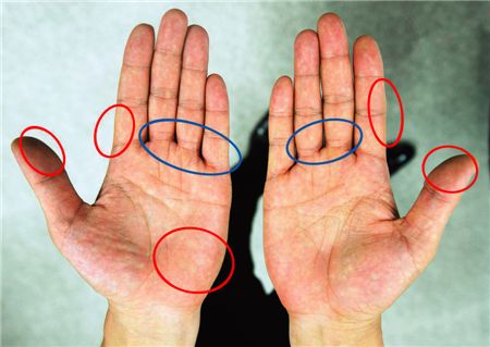 파란 표시 부분에 굳은살이 생기면 그립을 잘 잡았다는 뜻이며 붉은 표시는 잘못된 굳은살이다. 사진=윤동주 기자 doso7@