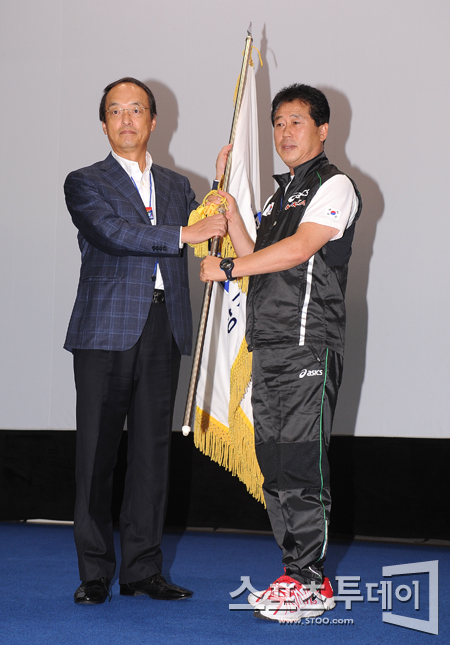 [태릉=스포츠투데이 정재훈 기자] 10일 오전 태릉선수촌 챔피언하우스에서 '대구세계육상선수권대회 국가대표선수단 발대식'이 열렸다. 오동진 대한육상연맹 회장(왼쪽)이 문봉기 총감독(오른쪽)에게 연맹기를 전달하고 있다.스포츠투데이 정재훈 사진기자 roze@<ⓒ아시아경제 & 재밌는 뉴스, 즐거운 하루 "스포츠투데이(stoo.com)">정재훈 사진기자 roze@<ⓒ아시아 대표 석간 '아시아경제' (www.newsva.co.kr) 무단전재 배포금지>