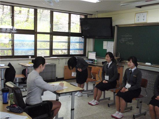 직장예절교육 특강 수업시간, 스튜어디스를 강사로 초청해 학생들에게 인사하는 법, 웃는 법 등에 대한 교육과 실습 중이다.