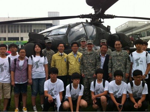 김문수 경기도지사(노란옷 오른쪽)가 김상곤교육감, 학생 기자단 등과 함께 아파치헬기 앞에서 포즈를 취하고 있다.