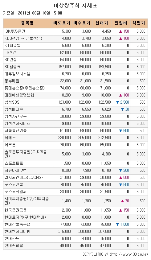 [아시아경제 천우진 기자] 장외주식 시장이 4거래일 연속 하락세를 이어갔다.기업공개(IPO) 관련주로 이달 29일 공모 예정인 반도체 메모리 테스트 핸들러 제조업체 테크윙이 2만1400원(-2.73%)으로 사흘만에 하락했다. 상장 승인기업 창고 자동화 시스템 업체 신흥기계는 8900원(+0.56%)으로 6거래일 연속 상승세를 이어갔다.심사 청구 종목으로 반도체 열처리 장비업체 테라세미콘과 카메라 모듈개발업체 엠씨넥스가 각각 1만6100원(+4.55%), 1만1250원(+6.64%)으로 강세를 선보였다. 물질검사 장비업체 케이맥은 2만5000원(-1.57%)으로 6거래일 만에 하락했다.삼성 관련주로 정보통신기술(ICT) 서비스기업 삼성SDS와 홈 네트워크 전문기업 서울통신기술이 각각 12만2500원(-2.00%), 6만원(-0.83%)으로 2일, 11일 동안 약세를 이어갔다. 정보보안 솔루션업체 시큐아이닷컴과 초음파 진단기 전문기업 삼성메디슨은 각각 8100원(-2.41%), 6620원(-0.45%)으로 내렸다.금융 관련주로 증권담보 대출업체 한국증권금융과 생명보험사 미래에셋생명이 각각 1만1650원(+1.30%), 1만원(+1.01%)으로 상승했다. 증권사 IBK투자증권과 하이투자증권은 각각 4450원(+3.49%), 1350원(+2.27%)으로 올랐다.제조업 관련주로 치과용 임플란트 제조업체 덴티움은 9만6000원(+0.52%)으로 사흘 연속 상승했다. 현대중공업 조선 자회사 현대삼호중공업과 무선통신기기 제조업체 SK텔레시스는 각각 7만5000원(-1.32%), 3700원(-2.63%)으로 하락해 5주, 52주 최저가로 밀려났다.그밖에 LG계열 IT서비스업체 엘지씨엔에스가 3만원(+1.69%)으로 이틀 연속 상승했다. 기업용 토털 소프트웨어업체 티맥스소프트도 3800원(+7.04%)으로 상승 전환했다. 종합건설사 포스코건설은 7만6500원(-0.65%)으로 내려 다시 52주 최저가 수준으로 내려왔다.자료제공: