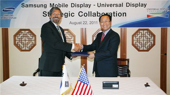 조수인(오른쪽) 삼성모바일디스플레이 사장과 스티븐 에이브램슨 유니버설 디스플레이 대표가 22일 서울에서 열린 전략적 제휴를 위한 계약에 서명한 뒤 악수하고 있다.