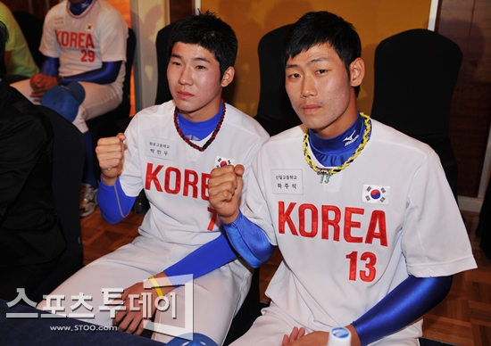 [스포츠투데이 정재훈 사진기자] 25일 잠실 롯데호텔 3층 크리스탈 볼룸에서 열린 롯데카드 프로야구 2012 신인선수 지명회의에서 NC에 지명된 휘문고 박민우(왼쪽)와 한화에 지명된 신일고 하주석(오른쪽)이 화이팅을 외치고 있다스포츠투데이 정재훈 사진기자 roze@<ⓒ아시아경제 & 재밌는 뉴스, 즐거운 하루 "스포츠투데이(stoo.com)">