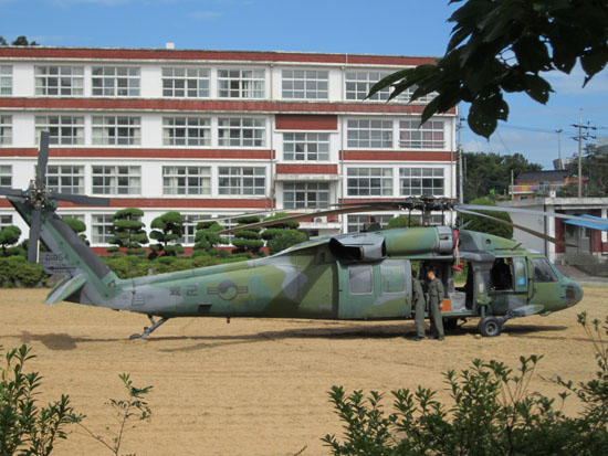 25일 이진삼 의원이 타고 온 육군 소속 헬기가 옛 청양여상 운동장에 내려 서 있다.(동양일보 제공)