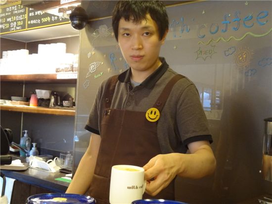 [아시아경제 조유진 기자]'저희 매장에서 일하고 있는 남자직원은 자폐를 안고 있습니다. 지난 28년 동안 많은 어려움 속에서 남들이 잘 몰라볼 정도로 많이 개선됐습니다… 언어와 상황대처에는 문제가 있어 손님께 결례를 범하게 되는 경우가 종종 있어서 이 글을 올리게 됐습니다. 많은 양해를 간절히 부탁드립니다'서울 마포구 홍익대학교 근처 커피숍 'With Coffee'. 가게 2층으로 올라가는 길목에 이런 내용의 '호소문'이 걸려있다. 주인공은 가게 대표 권순옥(58)씨의 아들이자 공동대표이며 2살 때 자폐 판정을 받은 이승진(30)씨다. '플렉스-풋 치타'라고 불리는 의족을 디딤돌 삼아 세상에 우뚝 선 남아공 육상선수 피스토리우스처럼 이씨는 커피와 가게, 가게를 찾는 사람들을 발판삼아 세상과 소통하는 중이었다. 언제나처럼 양 손을 귀 옆에 바짝 가져다 흔들며 "어서오세요"라고 손님을 반기는 이씨와 어머니 권씨를 25일 오후 가게에서 만났다.이씨가 태어날 때부터 자폐 판정을 받은 건 아니었다. 2살 때부터 사람과 눈을 마주치지 않고 피하기 시작하더니 말하는 능력까지 퇴행해버렸다. 결국 생후 35개월에 자폐증이라는 청천벽력같은 진단을 받았다. 권씨는 이때부터 아들의 일거수일투족이 되기 시작했다. 가까스로 아들을 초등학교에 입학시킨 권씨는 교실과 복도, 운동장에서까지 그를 지켜보고 돌봐야만 했다. 아들이 친구들한테서 무시당하거나 놀림을 받을까봐 되도록 깨끗한 옷을 입혔고 도시락 반찬에도 정성을 쏟았다. 하나하나 칼집을 내고 치즈를 말아 김으로 리본장식까지 한 햄을 반찬으로 싸주기도 했다. 권씨는 "단순히 좋은 반찬을 먹이고 싶은 게 아니라 '제 자식은 귀중합니다'라는 표현을 하고 싶었던 것"이라고 당시를 떠올렸다.중학교 2학년 때는 집단구타를 당해 온 몸에 피멍이 들기도 했다. 곱지 않은 시선과 노골적인 차별, 주위의 괴롭힘에 분통이 터지고 좌절했지만 권씨는 '나도 내 자식이 장애가 없었다면 마찬가지로 장애를 가진 이들에게 곱지 않은 시선을 던졌겠지'라는 생각으로 참고 또 참았다. 권씨는 용기를 내서 아들을 일반 고등학교로 진학시켰는데, 여기에서도 구타가 이어져 결국 특수학교로 전학을 보낼 수밖에 없었다.상처로 점철된 학창시절을 보낸 이씨. 어머니 권씨는 아들을 언제까지 싸고 있을 수만은 없다고 생각했다. 세상으로 끌어내 어엿한 사회 구성원으로 일으켜 세우자고 마음먹은 것이다. 권씨가 택한 건 '사람'과의 '소통'이었고, 아들의 디딤돌이 될 수 있는 생활기반으로 커피숍을 생각해냈다. 이런 다짐에서 탄생한 가게가 2009년 문을 연 'With Coffee'다. 가게 문을 열면서 아들을 공동대표로 세웠다. 대표 겸 직원인 이씨는 오전 11시부터 오후 7시까지 다른 직원들과 함께 손님을 맞고, 커피를 만들며 청소까지 한다. 재고 파악이나 재료 구입도 문제가 없다. 이씨 손을 거쳐간 커피가 5만 잔을 넘겼다는 게 권씨 설명이다. 권씨는 본인이 가게를 돌보는 시간을 조금씩 줄여 요즈음은 하루에 1~2시간만 근무한다. 이씨가 자리를 잡아가면서다. 권씨는 "아들이 인지능력 문제로 가끔 손님을 불쾌하게 만드는 경우가 있는데, 사정을 모르고 항의를 했다가 나중에 사연을 눈치채고 사과하는 손님도 계시다"고 말했다. 2층 어귀에 있는 호소문을 읽어본 경우라고 한다. 권씨는 "자폐라는 장애는 평생 안고 가야 하지만 아들이 사람들 속에서 소통하는 삶을 살도록 해주고 싶었다"면서 자폐를 안고 사는 사람들이 사람을 거부하는 것처럼 보이지만 사실은 너무도 간절하게 소통을 갈구한다고 거듭 강조했다. 조유진 기자 tint@<ⓒ세계를 보는 창 경제를 보는 눈, 아시아경제(www.asiae.co.kr) 무단전재 배포금지>