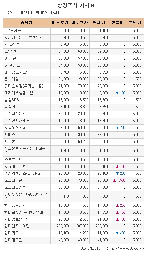 [아시아경제 천우진 기자] 비상장 시장이 이틀 연속 내렸다.기업공개(IPO) 관련주로 10월에 공모 예정인 태양광발전용 웨이퍼 생산업체 넥솔론이 1만2750원(-0.78%)으로 이틀 연속 하락했다. 산업용 로봇 생산업체 로보스타는 전일과 시세 변동이 없었다.상장 승인 기업으로 반도체 열처리 장비업체 테라세미콘이 1만7050원(+0.89%)으로 나흘 만에 반등했다. 비금속 광물제품 제조업체 사파이어테크놀로지와 물질검사 장비업체 케이맥은 각각 7만4250원(-4.01%), 2만2200원(-0.89%)으로 내렸다. 창고 자동화 시스템업체 신흥기계와 반도체 테스트업체 아이테스트는 각각 8700원(-2.25%), 2950원(-3.28%)으로 동반 하락했다.상장 심사 청구 기업으로 음반(콘텐츠) 제작업체 와이지엔터테인먼트가 37000원(+2.78%)으로 올라 이틀 연속 신고가를 기록했다. 가공 공작기계 제조업체 제이엠씨중공업은 4200원(-4.55%)으로 최저가를 갈아치우며 희비가 엇갈렸다.범 현대 계열 관련주로는 조선업체 현대삼호중공업과 종합 물류기업 현대로지엠이 각각 7만4200원(+0.95%), 1만1250원(+1.35%)으로 둘다 3거래일 연속 상승했다. 전업카드사 현대카드는 1만4600원(-2.67%)으로 내려 52주 최저가로 밀려났다.금융 관련주로는 증권담보 대출업체 한국증권금융이 1만1900원(+2.15%)으로 올라 상승세를 이어갔다. 생명보험사 미래에셋생명은 9900원(-1.00%)으로 이틀 쉬고 다시 밀려났고 할부금융 서비스업체 우리캐피탈도 2550원(-3.77%)으로 하락했다.그밖에 종합건설업체 포스코건설과 반도체 메모리 테스트 핸들러 제조업체 테크윙이 각각 7만6000원(+2.01%), 1만8000원(+5.88%)으로 테크윙이 이틀 연속 급등했다. 홈 네트워크 전문기업 서울통신기술과 차량용 카메라모듈 제조업체 엠씨넥스는 각각 5만6500원(-1.22%), 7500원(-10.18%)으로 약세를 보였다.자료제공: