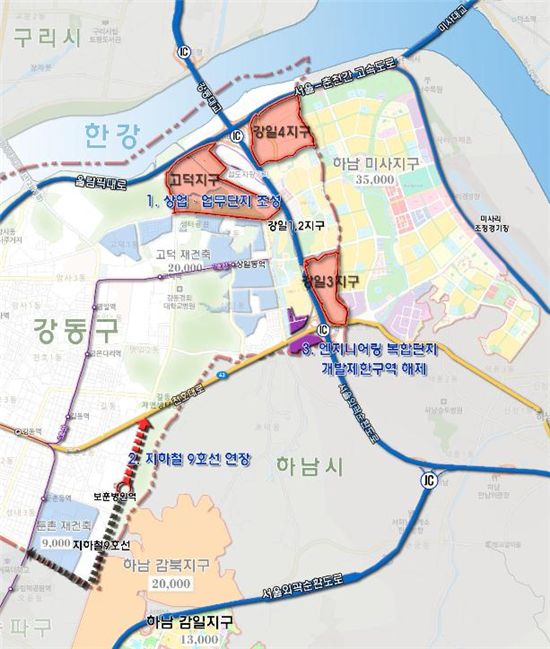 구는 재건축 시장에 끼치는 영향을 최소화하기 위해 고덕지구에는 아파트를 짓지 않고 업무와 상업, 공공청사·체육시설 등 도시지원시설과 업무·상업지구로 개발하는 안을 제시했다. 이 계획은 보금자리주택 지구로 지정된 3개 지구를 1개 지구로 통합하고 건립규모를 일정 부분 축소함으로써 실현 가능하다.즉 보금자리주택을 강일 3·4지구에만 한정하고 고덕지구에는 상업·업무기능을 보강한 대규모 단지로 조성한다면, 각종 편의시설 부족으로 불편을 겪었던 고덕동 일대의 경제 발전을 이끌어 내는 효과도 발생한다는 것이다. 강동구는 보금자리주택 규모를 축소하고 상업·업무 용도로 개발해 고덕동 일대 주거지역과 시너지를 창출하겠다는 계획이다. 이 같이 고덕지구를 상업·업무단지로 조성하면 약 9조원 경제적 파급효과와 연간 3만8000여명 고용 효과가 창출될 것으로 기대하고 있다고 했다. 현재 개발 중인 첨단업무단지와 더불어 강동 지역의 경제 활성화, 특히 고덕 재건축 아파트에도 큰 호재로 작용할 것이라는 것이다. 이와 함께 구는 보금자리주택지역인 3개 지구(고덕, 강일3·4지구)를 1개 지구(고덕·강일 지구)로 통합할 경우 이를 대비한 교통 정책 수립도 시급하다고 주장했다. 고덕·강일 지구가 통합 개발될 경우 지하철 등 대중교통 인프라 구축이 무엇보다 중요한데 그동안 지속적으로 논의되었던 지하철 9호선 연장안이 한층 당위성을 얻게 될 것으로 기대하고 있다. <strong>◆지하철 9호선 연장 요구...엔지니어링복합단지 부근 GB 해제 추진</strong> 강동구는 현재 보훈병원까지 공사 중인 지하철 9호선을 지하철5호선까지 연장해 줄 것을 요구, 향후 예견되는 고덕동·상일동·하남시 일대 교통문제를 해결해 나갈 계획이다.강동구 일대 주변 개발 현황