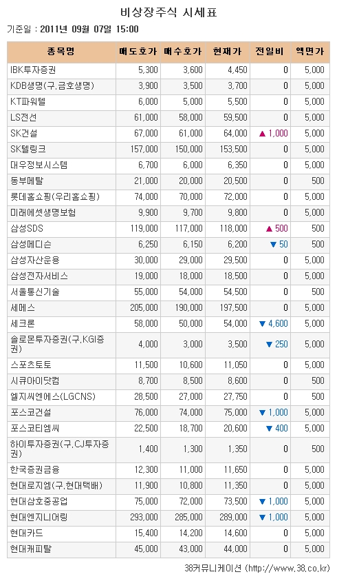 [아시아경제 천우진 기자] 비상장주식 시장이 이틀연속 내렸다.기업공개(IPO) 관련주로 다음주 15일 공모 청약 예정인 이차전지 공정용 장비업체 피앤이솔루션은 1만550원으로 시세 변동이 없었다. 다음달 5일 공모 청약 예정인 산업용 로봇생산업체 로보스타는 1만원(-5.66%)으로 이틀 연속 하락했다.상장 승인 기업으로 창고 자동화 시스템업체 신흥기계가 9300원(+1.09%)으로 이틀 연속 올랐으나 체인화 편의점업체 GS리테일이 3만1000원(-4.62%)으로 하락세로 돌아섰다. 비금속 광물제품 제조업체 사파이어테크놀로지와 물질검사 장비업체 케이맥이 각각 7만2500원(-1.02%), 2만1400원(-0.47%)으로 16일, 5일 동안 하락세가 이어졌다.심사 청구 기업으로 환경친화성원료 및 코팅제품 제조업체 나노가 5200원(-8.77%)으로 급락하며 다시 최저가를 갈아치웠다. 서버보안 솔루션업체 시큐브는 4300원(-4.44%)으로 이틀 만에 하락 반전했다.범 현대 관련주로는 토목엔지니어링 서비스기업 현대엔지니어링이 28만9000원(-0.34%)으로 약세를 기록했다. 조선업체 현대삼호중공업은 7만3500원(-1.34%)으로 상승 이후 7거래일 만에 하락했다.제조업 관련주로는 코아 및 금형생산업체 포스코티엠씨와 반도체 메모리 테스트 핸들러 제조업체 테크윙이 각각 2만600원(-1.90%), 1만7350원(-0.86%)으로 내렸다. 의료장비 제조업체 삼성메디슨은 6200원(-0.80%)으로 내려 8거래일 동안 약세가 이어졌다.그밖에 정보통신기술(ICT) 서비스기업 삼성SDS는 11만8000원(+0.43%)으로 사흘 만에 반등했다. 건설업체 SK건설은 6만4000원(+1.59%)으로 이틀 연속 올라 5주 최고가를 기록했다. 복권시스템 사업자 코리아로터리서비스와 증권사 솔로몬증권은 각각 1만4200원(-3.40%), 3500원(-6.67%)으로 하락하며 장을 마감했다.자료제공: