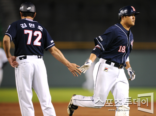 [스포츠투데이 정재훈 기자] 7일 오후 잠실 야구장에서 벌어진 '2011 롯데카드 프로야구' LG 트윈스와 두산 베어스의 경기 4회초 좌중간 홈런을 쳐낸 뒤 김민호 코치와 손뼉을 치고 있다. 스포츠투데이 정재훈 사진기자 roze@<ⓒ아시아경제 & 재밌는 뉴스, 즐거운 하루 "스포츠투데이(stoo.com)">