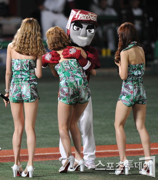 [스포츠투데이 정재훈 기자] 8일 오후 목동 야구장에서 열린 '2011 롯데카드 프로야구' 넥센 히어로즈와 한화 이글스의 경기에서 넥센 마스코트 턱돌이가 축하공연을 마친 달샤벳 멤버들을 끌어안고 있다.스포츠투데이 정재훈 사진기자 roze@<ⓒ아시아경제 & 재밌는 뉴스, 즐거운 하루 "스포츠투데이(stoo.com)">