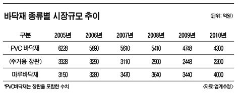 친환경 신공법 갖춰…'마루 전성시대' 뒤집기 나서[아시아경제 최대열 기자]정부가 바닥재 제품에 관한 안전기준을 강화하고 나선 가운데 바닥재시장을 양분하는 두 제품, 장판과 마루업체간 희비가 엇갈리고 있다.그간 환경친화적인 제품으로 인식되면서 승승장구하던 '마루'의 시장 확대에 제동이 걸린 사이 신공법을 등에 업은 '장판'이 반격에 나설 채비를 마쳤다. 각각의 제품을 주력으로 하는 업체들간 신경전도 치열해지는 양상이다.업계에서 추산하고 있는 국내 바닥재시장 규모는 지난해 기준 8300억원선. 이 가운데 장판·P타일 등 PVC바닥재가 4300억원, 강화마루·합판마루 등 목질바닥재가 4000억원 정도인 것으로 보고 있다. PVC바닥재는 주로 주택, 아파트 등 주거용과 빌딩 등에 쓰이는 상업용으로 나뉘며 목질바닥재는 주로 주거용으로 쓰인다.