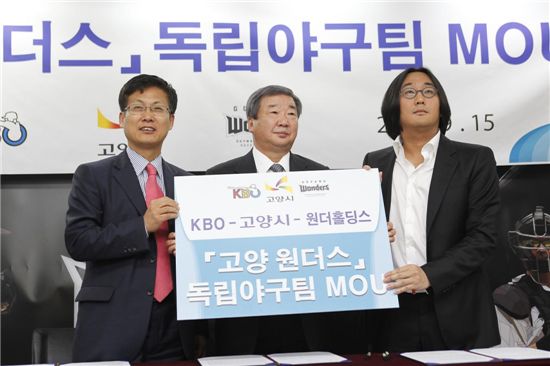 [아시아경제 이승종 기자] 국내 최초의 독립야구팀이 12월 창단한다. 소셜커머스 업체 위메이크프라이스는 15일 허민 위메프 대표가 한국야구위원회(KBO) 회관에서 고양시, KBO와 함께 독립야구단 '고양 원더스' 창단을 위한 양해각서(MOU)를 체결했다고 이날 밝혔다. 고양 원더스는 KBO에 속하지 않은 독립 팀으로 원더홀딩스와 고양시가 공동으로 운영한다. 국내에서 지방자치단체와 기업이 야구단을 운영하는 것은 이번이 처음이다. 원더홀딩스는 위메프의 지주회사로 허 대표가 이사회 의장으로 재직해 있다. 고양 원더스는 프로구단 지명을 받지 못한 고교, 대학 졸업생과 프로팀에서 방출된 선수들에게 새로운 기회를 제공하고, 야구 저변 확대, 유소년 및 사회인 야구육성을 목표로 창단된다.원더홀딩스 관계자는 "매년 프로구단에 입단하지 못한 많은 졸업생들이 갈 곳을 찾지 못해 어려움을 겪고 있는 상황에서 독립야구단은 고교야구 활성화에 큰 도움이 될 것"이라고 말했다. 허 대표는 매년 현재 2군팀 관리 예산에 준하는 15억~20억원 가량을 투자, 팀 운영을 이끌어갈 계획이다. 허 대표는 게임업체 네오플의 창업자로 수천억원대 자산가로 알려져 있다. 서울대 야구부 출신으로 전설의 너클볼 투수인 필 니크로에게 너클볼을 배울 정도로 유명한 야구광이다.고양시는 지난달 개장한 국가대표훈련장을 홈구장으로 제공하고, 추후 실내연습장 등 경기에 필요한 시설을 추가 건립할 예정이다. 또 KBO는 2012년부터 2군 리그(퓨처스 리그)에 고양 원더스의 경기일정을 편성하기로 했다. 고양 원더스는 10월 코치진 및 운영인력을 선발하고 11월 트라이아웃을 통해 선수단을 구성할 계획이다. 이어 12월 창단식, 내년 1월 동계훈련을 거쳐 프로야구 퓨처스리그 팀들과 번외 경기를 치르는 스케줄이다. 인원은 30명 규모로 시작해 점차 확대해 나갈 방침이다. 허 대표는 "성공스토리를 사회에 기부하고자 어린 시절의 꿈인 야구선수 육성을 선택했다"며 "앞으로 다양한 분야의 인재 육성에 이바지하고 싶다"고 말했다. 한편 부산 출신인 허 대표는 프로야구팀 롯데 팬으로 알려졌다.이승종 기자 hanarum@<ⓒ세계를 보는 창 경제를 보는 눈, 아시아경제(www.asiae.co.kr) 무단전재 배포금지>