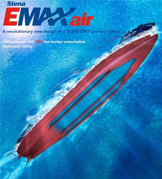 스테나가 설계한 15만DWT급 석유제품 운반선 ‘이맥스 에어(E-MAX air)’ 개념도. 선체 아래에 공기가 발산(선체 중간 파란색 부분)돼 물과의 마찰을 줄임으로써 연료비를 줄일수 있다.<br />