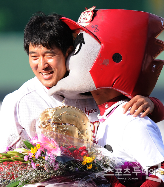 [목동=스포츠투데이 정재훈 기자] 18일 오후 목동 야구장에서 '롯데카드 프로야구 2011' 넥센 히어로즈와 삼성 라이온즈의 경기에 앞서 '캡틴' 이숭용의 은퇴식이 열렸다. 턱돌이가 이숭용에게 골든 미트를 건넨 뒤 기습 뽀뽀를 시도하고 있다.스포츠투데이 정재훈 사진기자 roze@<ⓒ아시아경제 & 재밌는 뉴스, 즐거운 하루 "스포츠투데이(stoo.com)">