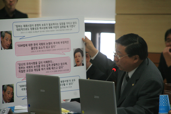 민주당 조경태 의원이 20일 국회 지식경제위의 중소기업청 국정감사장에서 김종훈 통상교섭본부장이 외국기업에 SSM법 입법관련 개입약속 내용을 공개하고 있다.