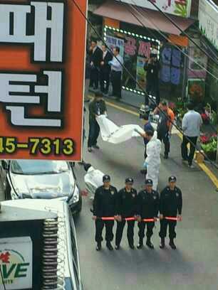 23일 낮 12시5분께 서울 종로구 창신동 제일2상호저축은행 본점 앞길에 정구행 행장이 엎드린 채 숨져 있는 것을 순찰 중이던 관할 파출소 경찰관이 발견, 시신을 이송하고 있다. (사진=박재일씨 제공)
