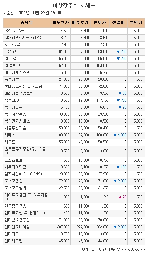[아시아경제 천우진 기자] 비상장주식 시장이 5거래일 연속 하락했다.기업공개(IPO) 관련주로 다음주 27일 코스닥 상장 예정인 이차전지 공정용 장비 제조업체 피앤이솔루션이 1만950원(-2.67%)으로 이틀 연속 내렸다. 다음달 5일 공모 예정인 산업용 로봇 생산업체 로보스타와 다음달 13일 공모 예정인 물질검사 장비업체 케이맥은 각각 9500원(-2.56%), 2만650원(-0.96%)으로 내렸다.다음주 29일 공모 예정인 과학기기 생산업체 대한과학은 5100원(+2.00%)으로 4거래일 연속 올랐다. 다음달 12일 공모 예정인 음반 제작업체 와이지엔터테인먼트도 5만4000원(+1.89%)으로 신고가를 갈아치웠다. 다음달 20일 공모 예정인 반도체 열처리 장비업체 테라세미콘도 2만350원(+10.60%)으로 신고가를 기록했다.서버보안 솔루션업체 시큐브는 심사 승인효과로 4950원(+47.76%)으로 급등했다. 창고 자동화시스템업체 신흥기계는 1만2000원(-0.41%)으로 사흘 연속 하락했다. 심사 청구기업으로 터보엔진 기계제조업체 뉴로스는 9700원(+1.04%)으로 하락 하루 만에 반등했다.삼성 관련주로는 반도체 세정장비업체 세메스와 정보통신기술(ICT) 서비스기업 삼성SDS가 각각 18만8000원(-2.08%), 11만7750원(-0.63%)으로 내렸다. 정보 보안솔루션업체 시큐아이닷컴과 의료기기 제조업체 삼성메디슨은 각각 8350원(-1.76%), 6070원(-0.33%)으로 하락했다.건설 관련주로는 토목 엔지니어링 서비스기업 현대엔지니어링이 28만2000원(-0.70%)으로 이틀 연속 내렸다. 종합 건설업체 포스코건설과 건설업체 SK건설은 각각 7만1000원(-2.74%), 6만5500원(-1.13%)으로 내렸다.그밖에 절연선 및 케이블 제조업체 LS전선이 5만9000원(-0.42%)으로 내려 5주 최저가로 밀려났다. 반도체 메모리 테스트 핸들러 제조업체 테크윙과 복권시스템 사업자 코리아로터리서비스는 각각 1만6500원(-2.37%), 1만3750원(-1.08%)으로 하락하며 장을 마감했다.자료제공: